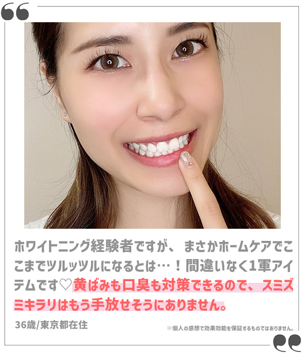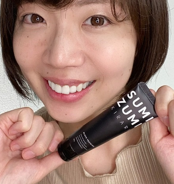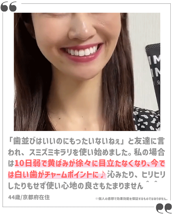 写真を見たら自分だけ歯が薄茶色で….評判のいいスミズミキラリを使い始めました。コーヒーや紅茶を愛飲している私でも毎日使うようになってから、くっきり白い歯に…!!これはズボラさんにもお勧めしたい名品です!
