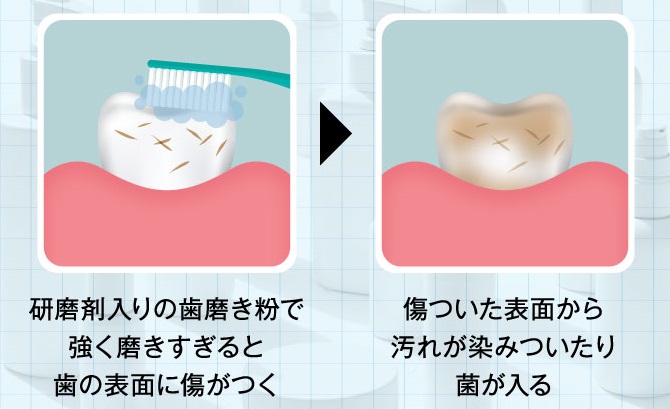 市販の歯磨き粉には、汚れを取るために強い研磨剤(汚れを削って落とす成分)が入っていることがあります。