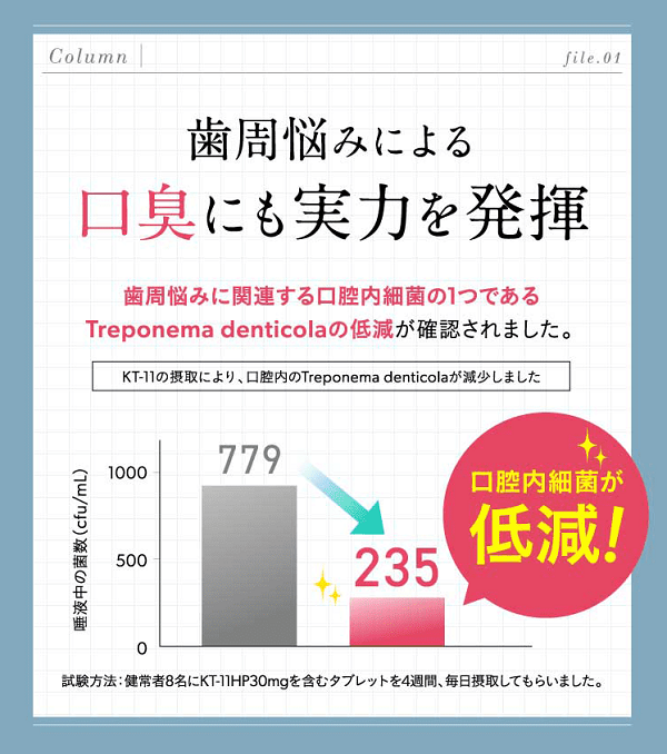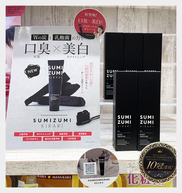 スミズミキラリは、炭で臭いを吸着するだけでなくマウスケア業界で注目を集めている新成分KT-11に加え、ラ・フローラK-1を配合しています。